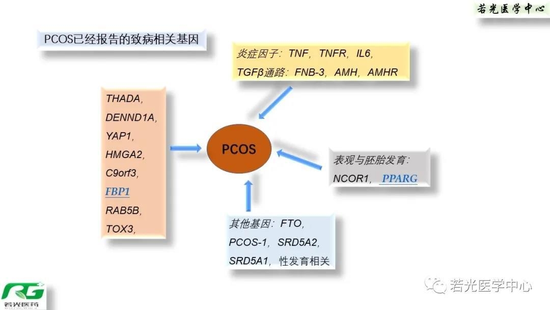 由于我们可以看出,PCOS的遗传学报告因素包括:(1)类固醇转化合成及其效应(受体)变异;(2)代谢因素(高胰岛素血症胰岛素拒抗糖耐量受损相关,以及脂代谢相关的脂肪营养不良等)关联遗传变异;(3)转化生长因子相关生殖性发育相关基因变异,如AMH等,性腺产生高雄相关;(4)生长因子相关基因变异如IGF及IGFR等。(5)细胞分化与增殖等。(6)其他类型,如先天性多囊卵巢等。