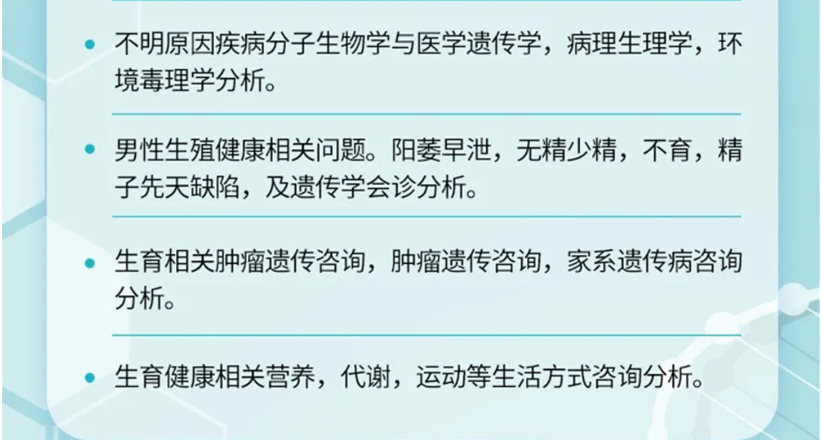(6)表型-征象-分子遗传联合分析,遗传咨询分析与分子诊断。产前胎儿影像(超声,MRI)等异常,各类胎儿先天畸形与出生缺陷表型-基因-家系遗传分析,产前产后胎儿异常分析咨询,生育健康咨询。