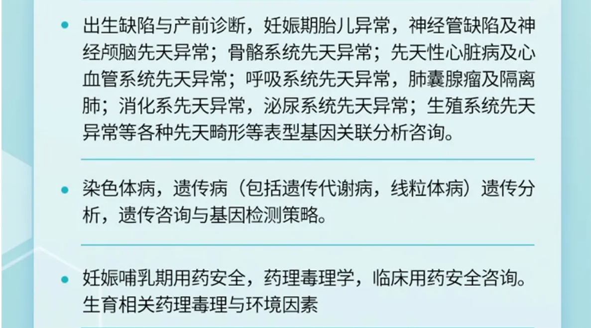 (6)表型-征象-分子遗传联合分析,遗传咨询分析与分子诊断。产前胎儿影像(超声,MRI)等异常,各类胎儿先天畸形与出生缺陷表型-基因-家系遗传分析,产前产后胎儿异常分析咨询,生育健康咨询。